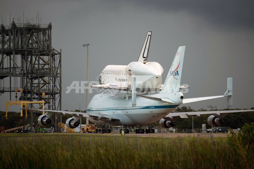 写真はケネディ宇宙センターで、輸送機の背に固定されたエンデバー(2012年9月19日撮影)。(c)AFP/NASA/Bill INGALLS