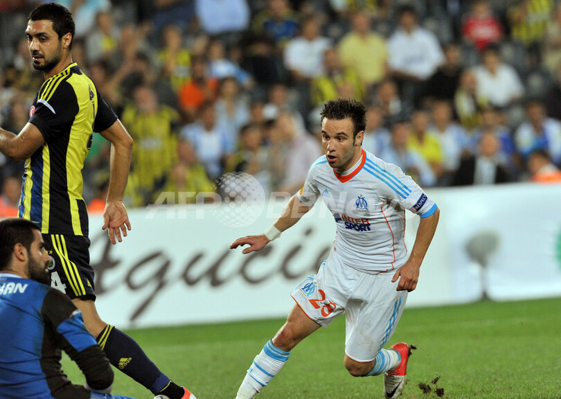 後半38分に得点を挙げたオリンピック・マルセイユのマシュー・ヴァルブエナ(Mathieu Valbuena、右、2012年9月20日撮影)。(c)AFP/BULENT KILIC