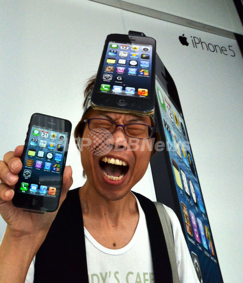 写真は都内のソフトバンクショップでiPhone 5を手に喜ぶ購入者(2012年9月21日撮影)。(c)AFP/Yoshikazu TSUNO