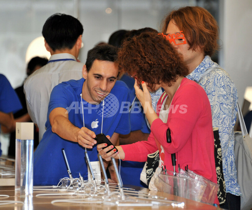 写真は都内のアップルストアでiPhone 5を手に取る客(2012年9月21日撮影)。(c)AFP/Yoshikazu TSUNO