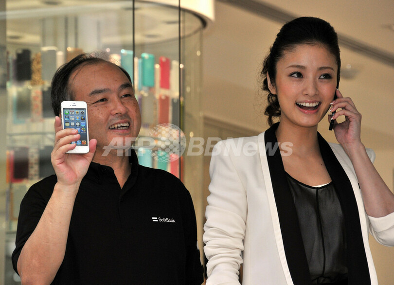 写真は都内のソフトバンクショップでiPhone 5をアピールする孫社長(左)と上戸さん(2012年9月21日撮影)。(c)AFP/Yoshikazu TSUNO