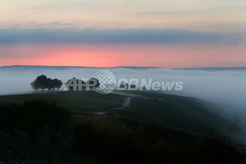 Escherndorf)近郊のブドウ畑に立ち込める朝霧。(c)AFP