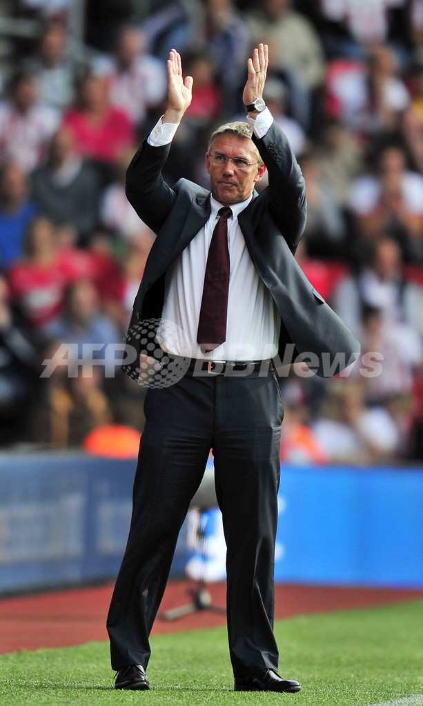 サポーターの声援に応えるサウサンプトンのナイジェル・アドキンス(Nigel Adkins)監督(2012年9月22日撮影)。(c)AFP/GLYN KIRK