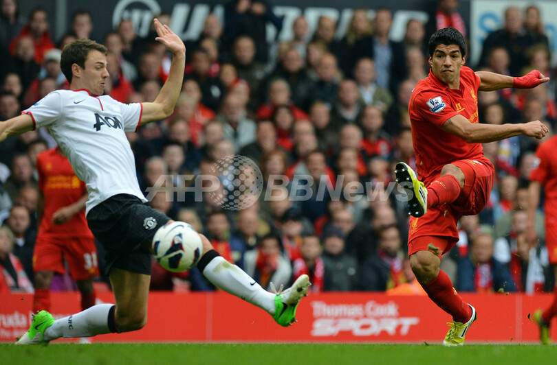 マンチェスター・ユナイテッドのジョニー・エヴァンズ(Jonny Evans、左)を前にシュートを放つリバプールのルイス・スアレス(Luis Suarez、2012年9月23日撮影)。(c)AFP/PAUL ELLIS