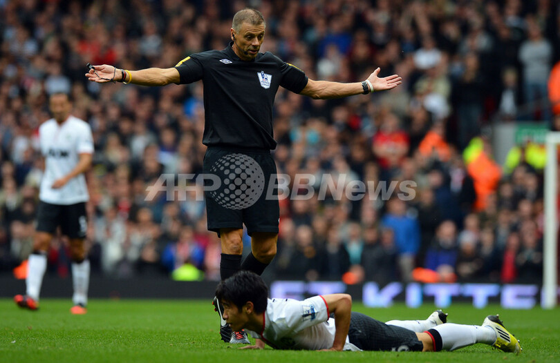 マーク・ハルシー(Mark Halsey、上)主審の前でピッチに倒れるマンチェスター・ユナイテッドの香川真司(Shinji Kagawa、2012年9月23日撮影)。(c)AFP/PAUL ELLIS