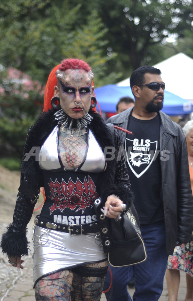 【9月23日 AFP】「バンパイア(吸血鬼)・ウーマン」の異名をとるメキシコ人のマリア・ホセ・クリステルナ(Maria Jose Cristerna)さんが、グアテマラの首都グアテマラ市(Guatemala City) のラ・アウロラ動物園(La Aurora Zoo)で開かれた中南米のカルチャーイベント「Latin American Extreme Unity Fest」に登場した。クリステルナさんは、顔や体に施したタトゥーやピアスなどの身体改造でギネス世界記録(Guinness World Records)に認定されている。(c)AFP