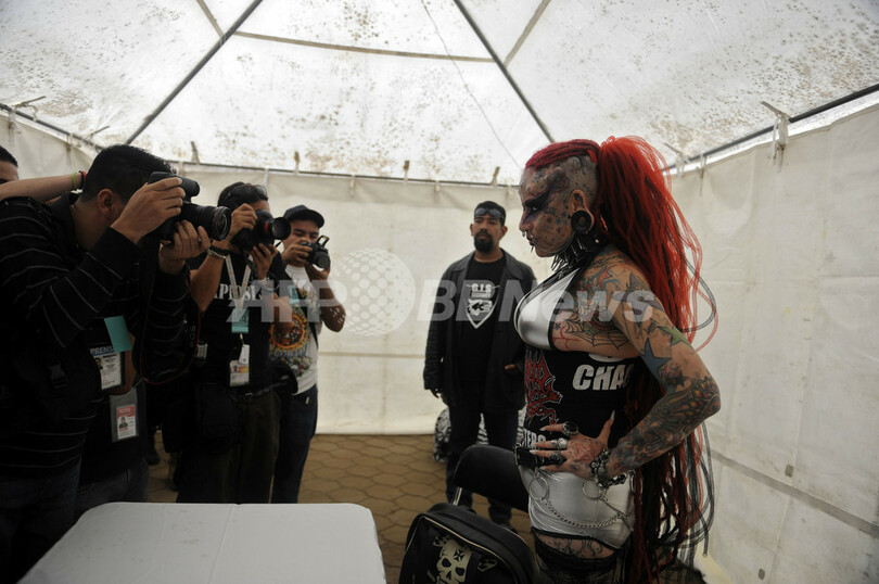 【9月23日 AFP】「バンパイア(吸血鬼)・ウーマン」の異名をとるメキシコ人のマリア・ホセ・クリステルナ(Maria Jose Cristerna)さんが、グアテマラの首都グアテマラ市(Guatemala City) のラ・アウロラ動物園(La Aurora Zoo)で開かれた中南米のカルチャーイベント「Latin American Extreme Unity Fest」に登場した。クリステルナさんは、顔や体に施したタトゥーやピアスなどの身体改造でギネス世界記録(Guinness World Records)に認定されている。(c)AFP