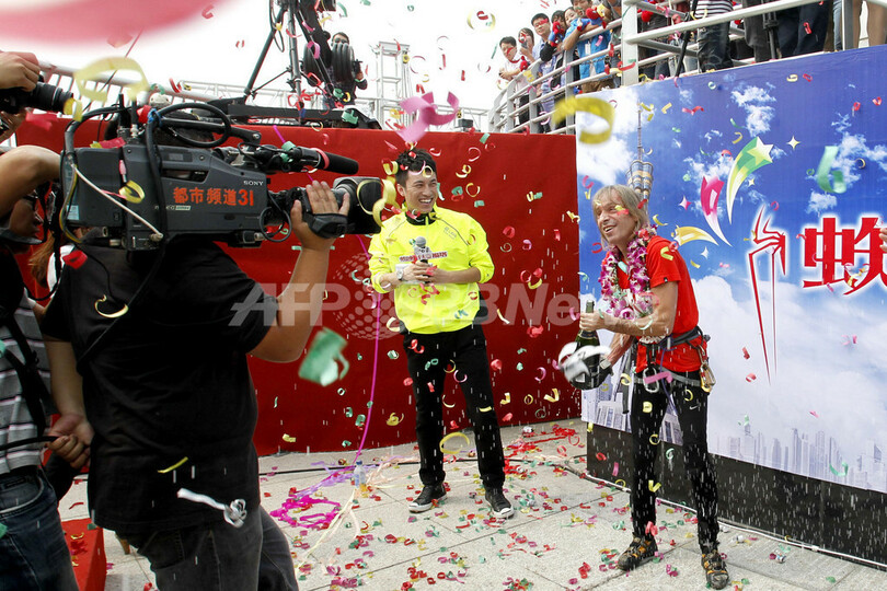 中国国営メディアによると、ロベールさんは約2時間で地上268メートルの高さにある展望デッキまで到達した。写真は展望デッキで祝福されるロベールさん(2012年9月22日撮影)。(c)AFP