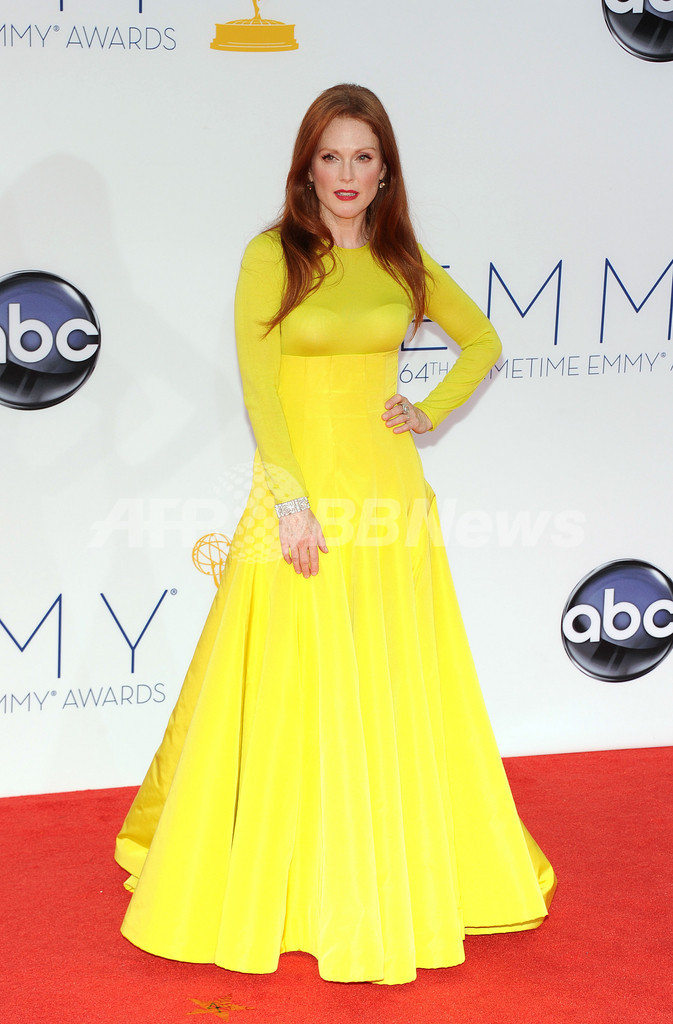 米テレビ界最高峰の賞である第64回プライムタイム・エミー賞(Primetime Emmy Awards)の授賞式が23日、米カリフォルニア(California)州ロサンゼルス(Los Angeles)で開催され、多くのスターが出席した。写真は、レッドカーペットに登場した女優ジュリアン・ムーア(Julianne Moore、2012年9月23日撮影)。(c)AFP/ROBYN BECK