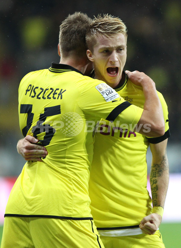 ゴールを喜ぶボルシア・ドルトムントのルカシュ・ピズチェク(Lukasz Piszczek、左)とマルコ・ロイス(Marco Reus、2012年9月25日撮影)。(c)AFP/DANIEL ROLAND