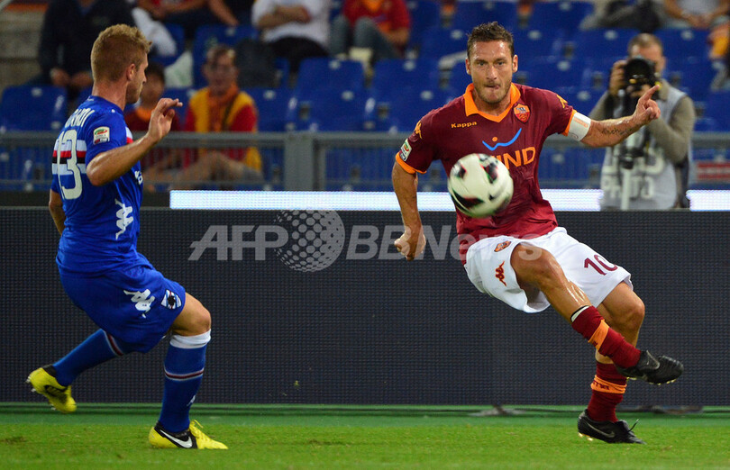 【9月27日 AFP】12-13イタリア・セリエAは26日、第5節の試合が各地で行われ、ASローマ(AS Roma)のフランチェスコ・トッティ(Francesco Totti)がサンプドリア(Sampdoria)戦で得点し、リーグ歴代3位に並ぶ通算216ゴール目を記録した。