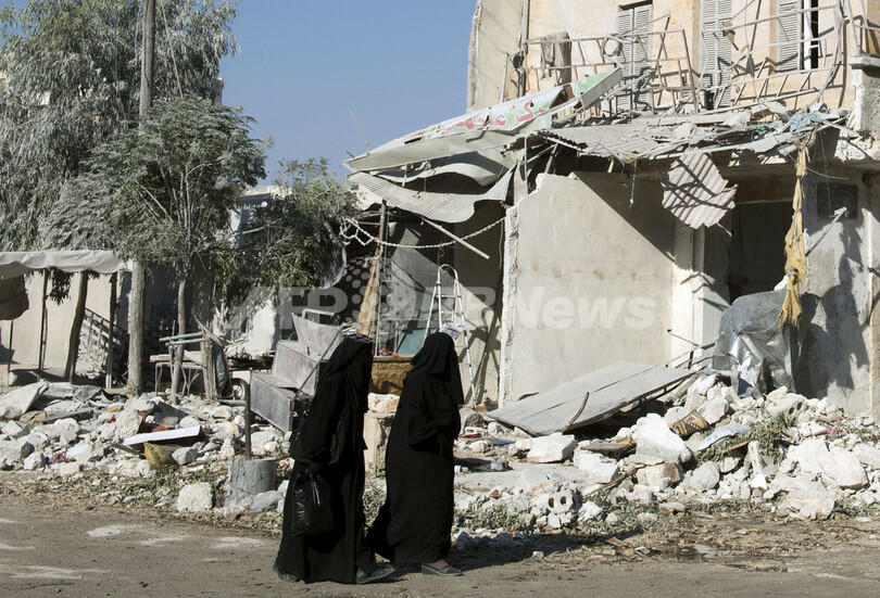 写真はアレッポ(Aleppo)で、政府軍と反体制派との戦闘で破壊された建物の脇を通り過ぎる女性たち(2012年9月25日撮影)。(c)AFP/MIGUEL MEDINA