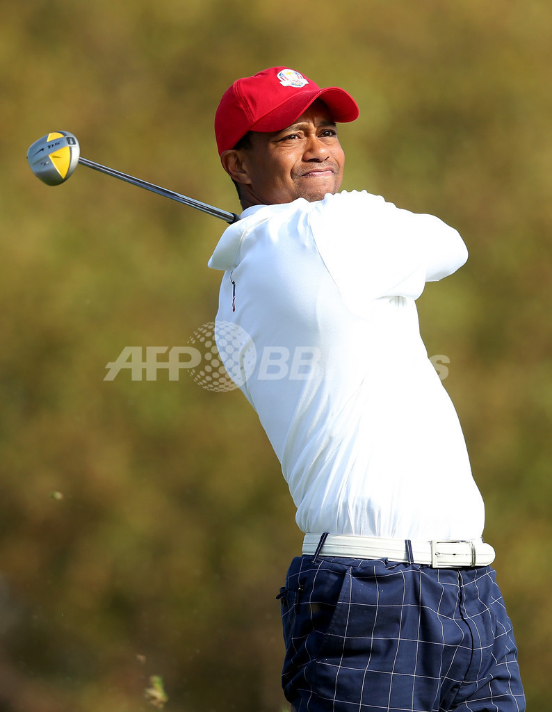 午前中のフォアサムでティーショットを打つ米国選抜のタイガー・ウッズ(Tiger Woods、2012年9月28日撮影)。(c)AFP/Getty Images/Andy Lyons