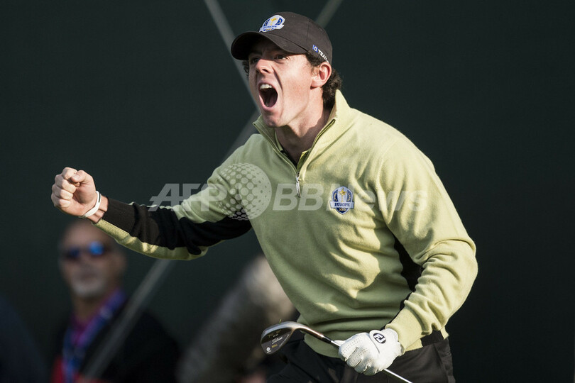 午前中のフォアサムで勝利を収め喜ぶ欧州選抜のロリー・マキロイ(Rory McIlro、2012年9月28日撮影)。(c)AFP/Brendan SMIALOWSKI