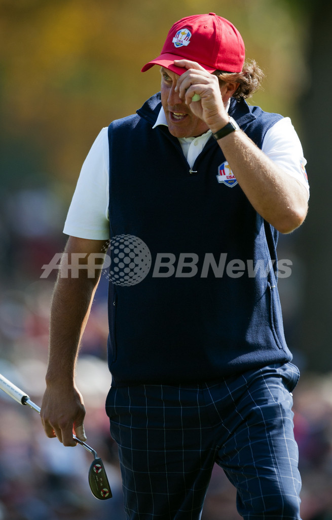 午後のフォアボールでパットを沈め、観衆の声援に応える米国選抜のフィル・ミケルソン(Phil Mickelson、2012年9月28日撮影)。(c)AFP/Jim WATSON