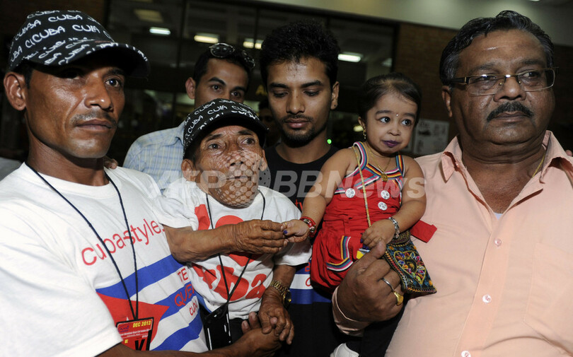 【9月28日 AFP】ギネス世界記録(Guinness World Records)で存命中の人物として「世界一背の低い女性」に認定されたインド人のジョティ・アムゲ(Jyoti Amge)さん(19)と、「世界一背の低い男性」としてギネス認定されたネパール人のチャンドラ・バハドゥール・ダンギ(Chandra Bahadur Dangi)さん(72)が27日、ネパールの首都カトマンズ(Kathmandu)の国際空港で初めて顔を会わせた。