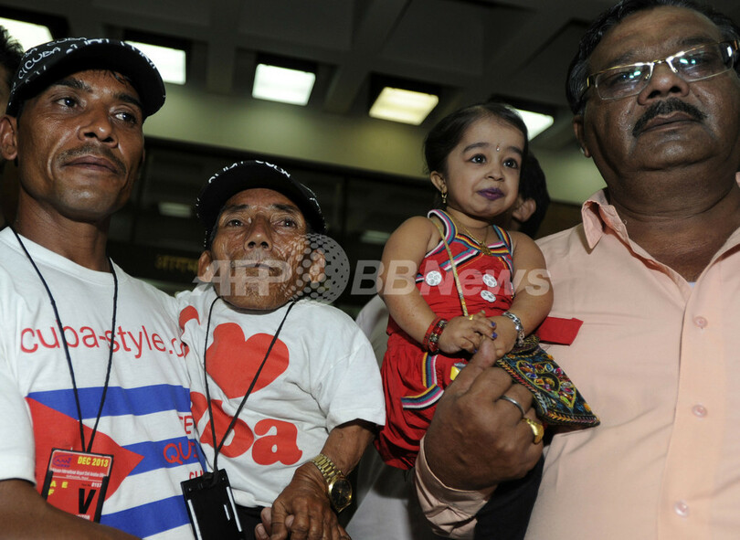 【9月28日 AFP】ギネス世界記録(Guinness World Records)で存命中の人物として「世界一背の低い女性」に認定されたインド人のジョティ・アムゲ(Jyoti Amge)さん(19)と、「世界一背の低い男性」としてギネス認定されたネパール人のチャンドラ・バハドゥール・ダンギ(Chandra Bahadur Dangi)さん(72)が27日、ネパールの首都カトマンズ(Kathmandu)の国際空港で初めて顔を会わせた。