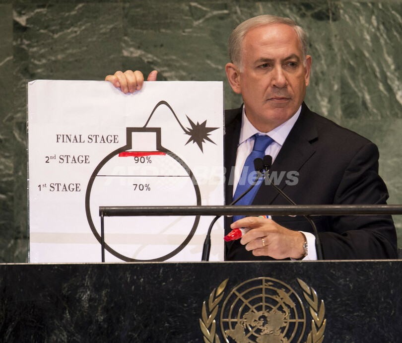 さらにネタニヤフ首相は、核兵器に見立てたイラストを用いてイランのウラン濃縮活動を説明。すでに核兵器製造に足る70%の過程まで進んでいるとし、濃縮を阻止すべき部分に実際に赤色のペンで「一線」を引いてみせた。
