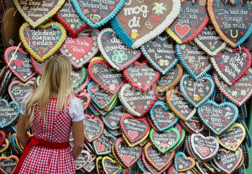 写真は、会場に陳列されたハート形のジンジャーブレッドに書かれたメッセージを読む女性(2012年9月26日撮影)。(c)AFP/PETER KNEFFEL