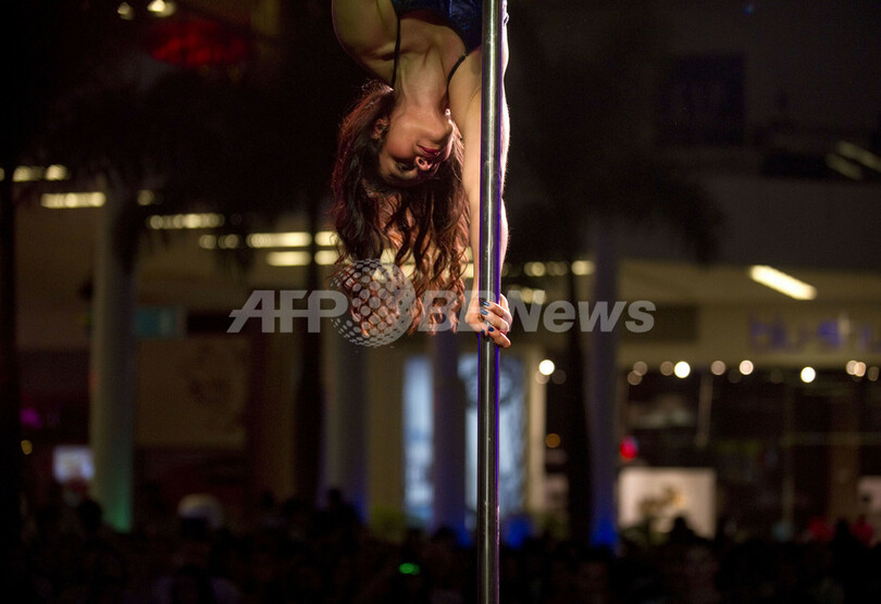 南米コロンビアのアンティオキア(Antioquia)州メデジン(Medellin)で、ポールダンスの大会「ミス・ポールダンス・コロンビア2012(Miss Pole Dance Colombia 2012)」が26日、開幕した(2012年9月26日撮影)。(c)AFP/Raul ARBOLEDA
