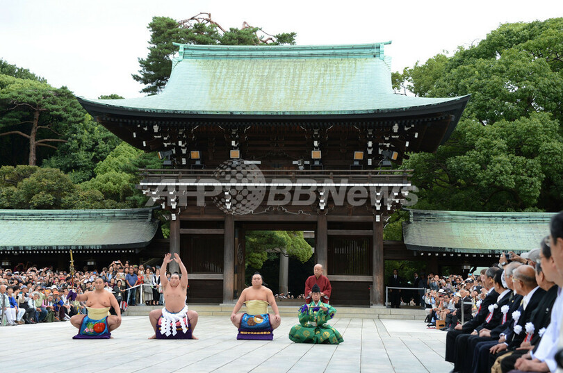 【9月29日 AFP】新横綱の日馬富士(Harumafuji)が28日、明治神宮(Meiji Shrine)で奉納土俵入りを行った。