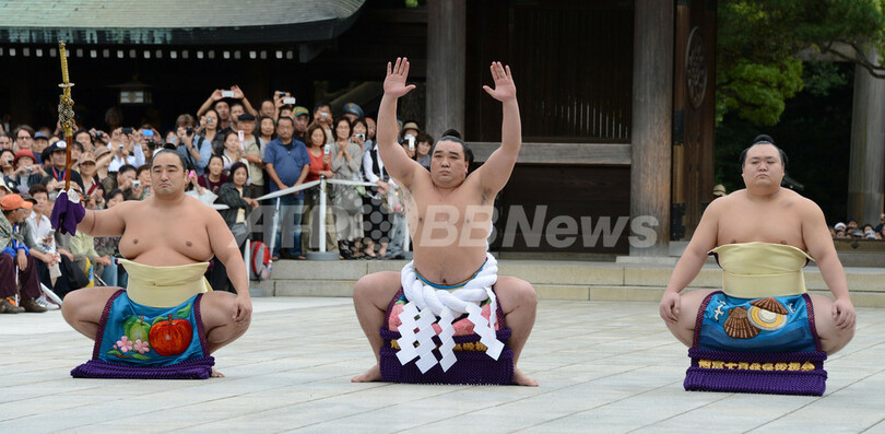 【9月29日 AFP】新横綱の日馬富士(Harumafuji)が28日、明治神宮(Meiji Shrine)で奉納土俵入りを行った。