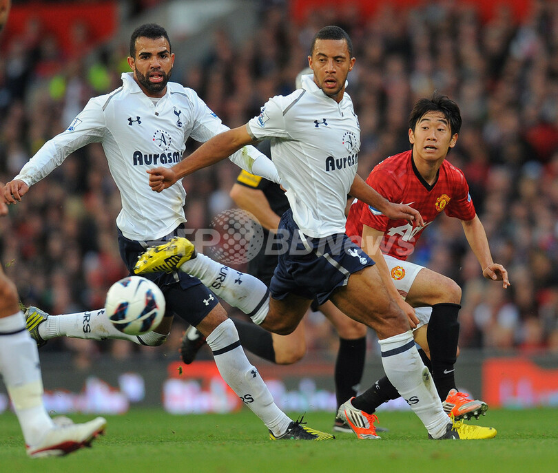 トッテナム・ホットスパーのサンドロ(Sandro Ranieri Guimaraes Cordeiro、左)、ムッサ・デンベレ(Moussa Dembele、中央)とボールを競るマンチェスター・ユナイテッドの香川真司(Shinji Kagawa、2012年9月29日撮影)。(c)AFP/ANDREW YATES