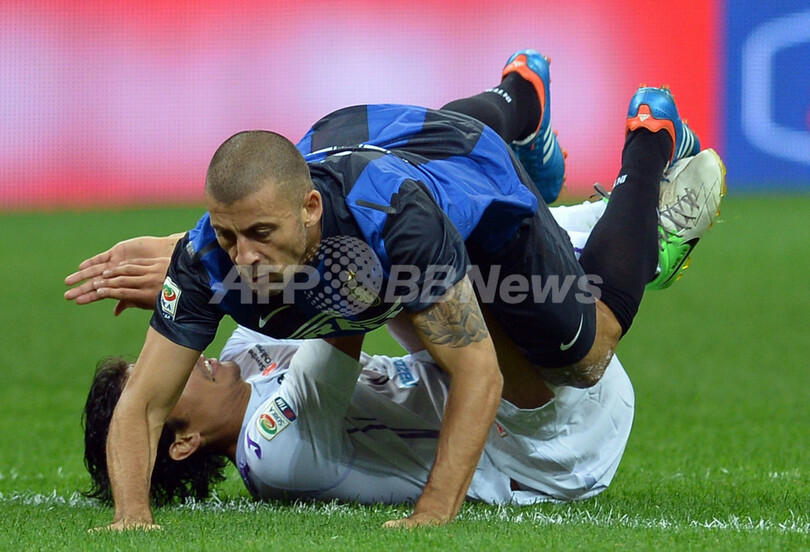 フィオレンティーナのマティアス・フェルナンデス(Matias Fernandez、下)との競り合いで転倒するインテルのワルテル・サムエル(Walter Samuel、2012年9月30日撮影)。(c)AFP/ALBERTO PIZZOLI