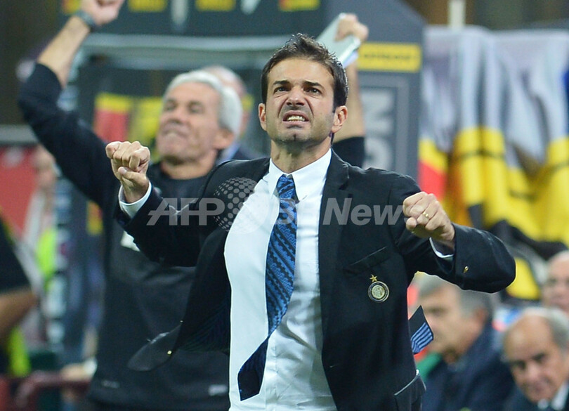試合に勝利し歓喜するインテルのアンドレア・ストラマッチョーニ(Andrea Stramaccioni)監督(2012年9月30日撮影)。(c)AFP/ALBERTO PIZZOLI