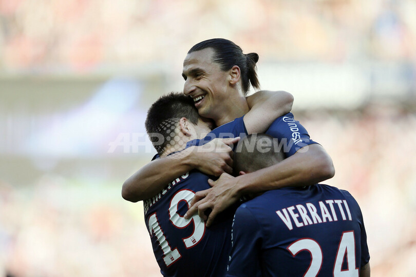 得点を決めたケヴィン・ガメイロ(Kevin Gameiro、左)と喜ぶパリ・サンジェルマンのズラタン・イブラヒモビッチ(Zlatan Ibrahimovic、2012年9月29日撮影)。(c)AFP/KENZO TRIBOUILLARD