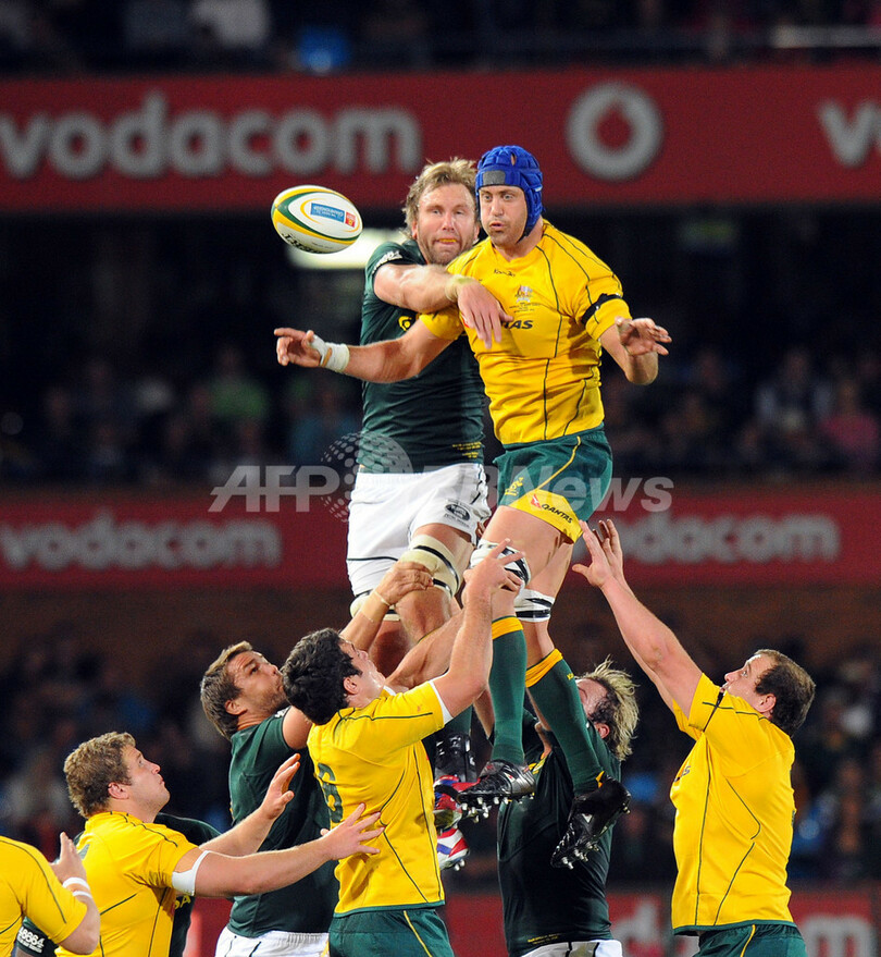 ラインアウトのボールを競るワラビーズのニック・フィップス(Nick Phipps、右)とスプリングボクスのアンドリース・ベッカー( Andries Bekker、2012年9月29日撮影)。(c)AFP/ALEXANDER JOE