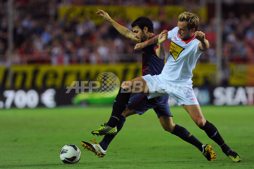 セビージャFCのイヴァン・ラキティッチ(Ivan Rakitic、右)とボールを競るFCバルセロナのセスク・ファブレガス(Cesc Fabregas、2012年9月29日撮影)。(c)AFP/JORGE GUERRERO