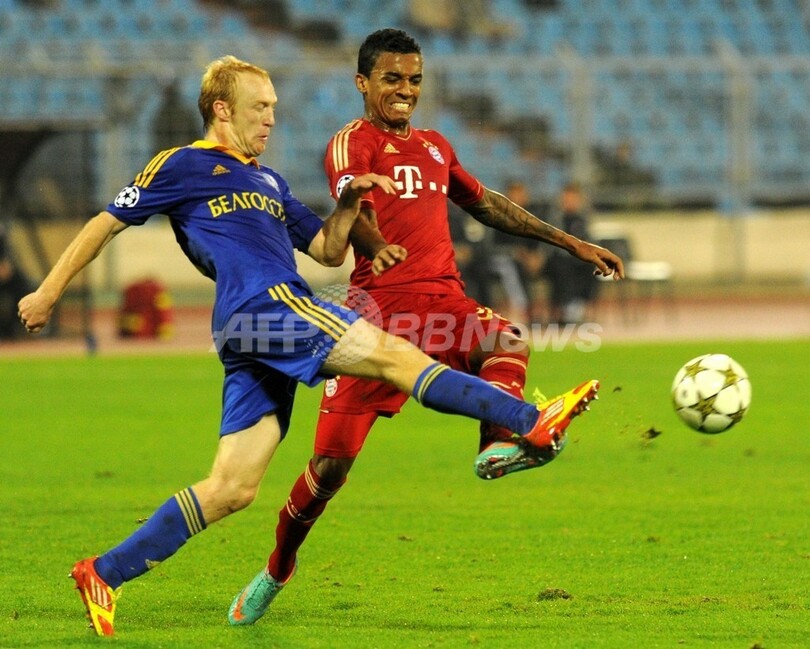 ボールを競るBATEボリソフのアレクサンドル・パブロフ(Aleksandr Pavlov、左)とバイエルン・ミュンヘンのルイス・グスタヴォ(Luiz Gustavo、2012年10月2日撮影)。(c)AFP/VIKTOR DRACHEV