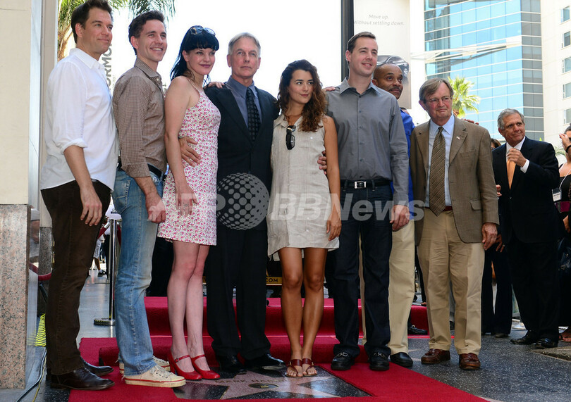 米人気テレビシリーズ「NCIS ~ネイビー犯罪捜査班(NCIS)」などで知られる俳優マーク・ハーモン(Mark Harmon)がハリウッドの殿堂「ハリウッド・ウォーク・オブ・フェーム(Hollywood Walk of Fame)」入りを果たし、1日に記念式典が開かれた。写真は、祝福に駆けつけた「NCIS」の共演者らと記念撮影をするハーモン(2012年10月1日撮影)。(c)AFP/Frederic J. BROWN