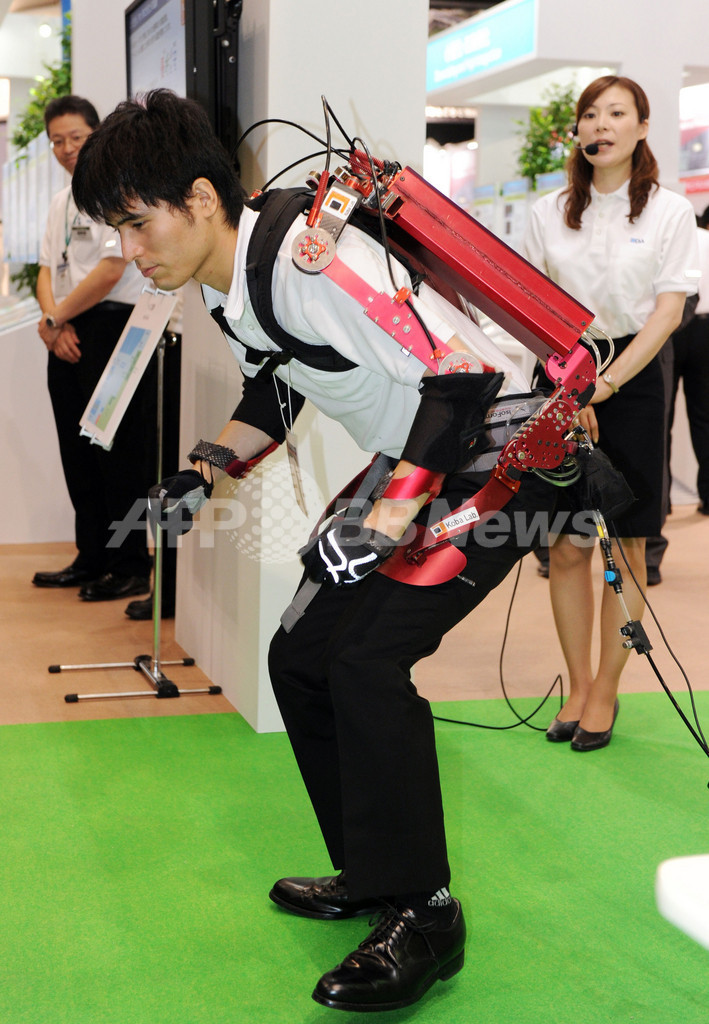 写真は、東京理科大学(Tokyo University of Science)の小林宏(Hiroshi Kobayashi)教授の開発した「マッスルスーツ」を披露する同大の学生。圧縮空気を動力とし、作業の補助や要介護者の動きを補助する(2012年10月2日撮影)。(c)AFP/Yoshikazu TSUNO