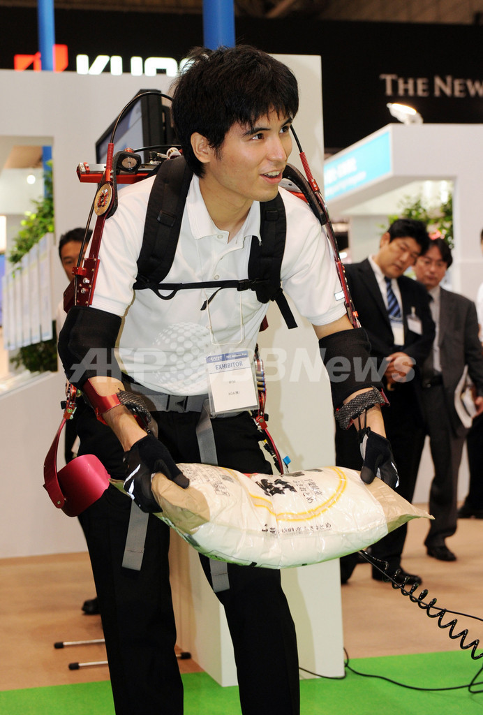 写真は、東京理科大学(Tokyo University of Science)の小林宏(Hiroshi Kobayashi)教授の開発した「マッスルスーツ」を披露する同大の学生。圧縮空気を動力とし、作業の補助や要介護者の動きを補助する(2012年10月2日撮影)。(c)AFP/Yoshikazu TSUNO