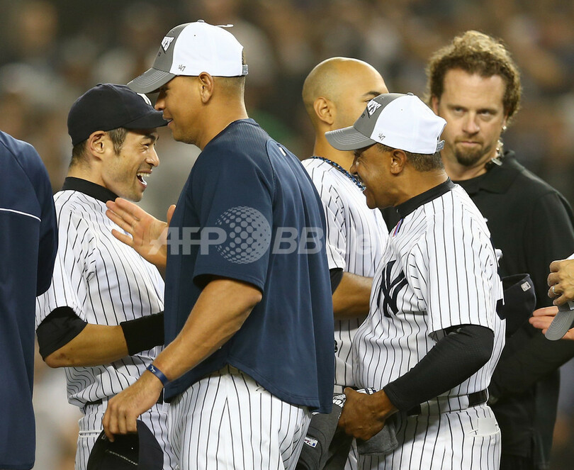 地区優勝を飾り、チームメイトと歓喜するニューヨーク・ヤンキースのイチロー(Ichiro Suzuki、左、2012年10月3日撮影)。(c)AFP/Getty Images/Elsa