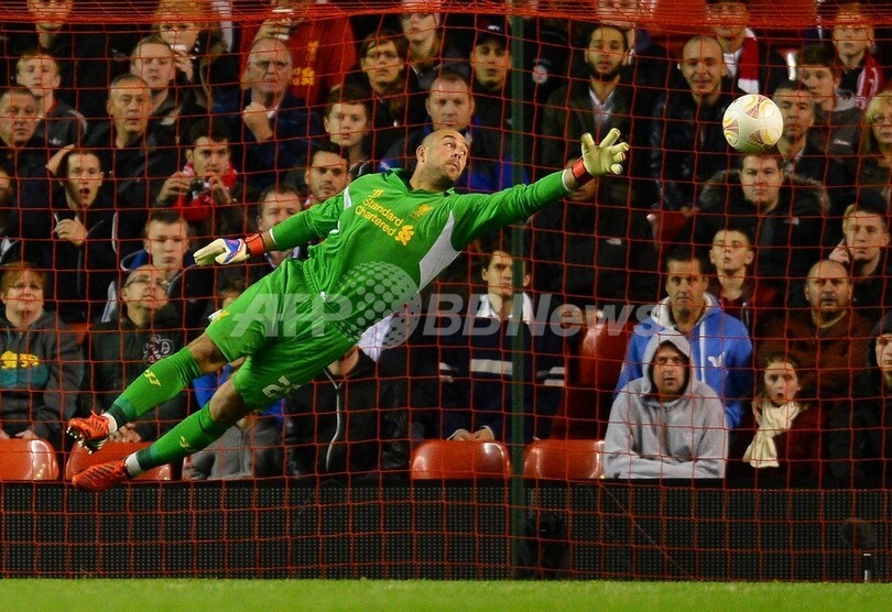 ウディネーゼのアントニオ・ディ・ナターレ(Antonio Di Natale)のシュートに反応するリバプールのGKホセ・マヌエル・レイナ(Jose Manuel Reina、2012年10月4日撮影)。(c)AFP/ANDREW YATES