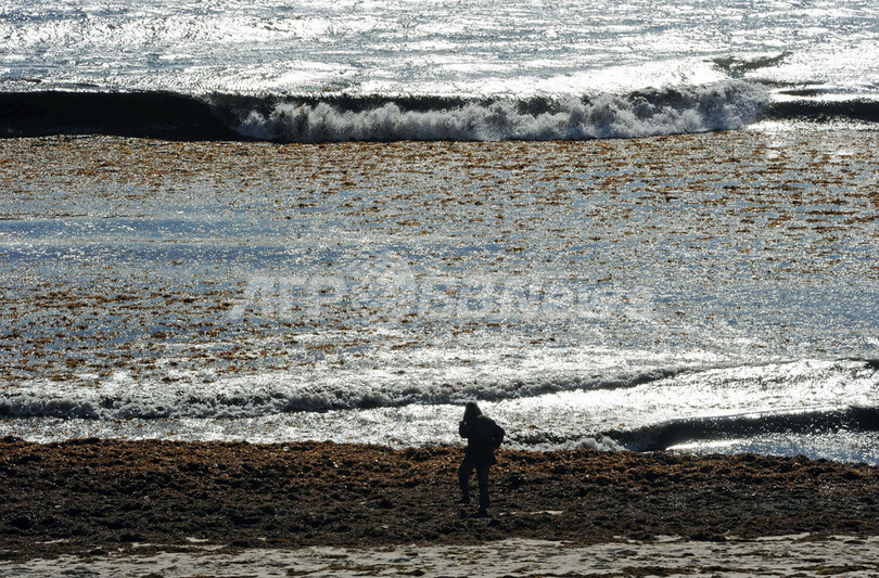 砂浜と波打ち際を覆い隠した海藻の影響で、ビーチは閉鎖を余儀なくされた。最近あった嵐の結果、打ち上げられたものとみられている。(c)AFP