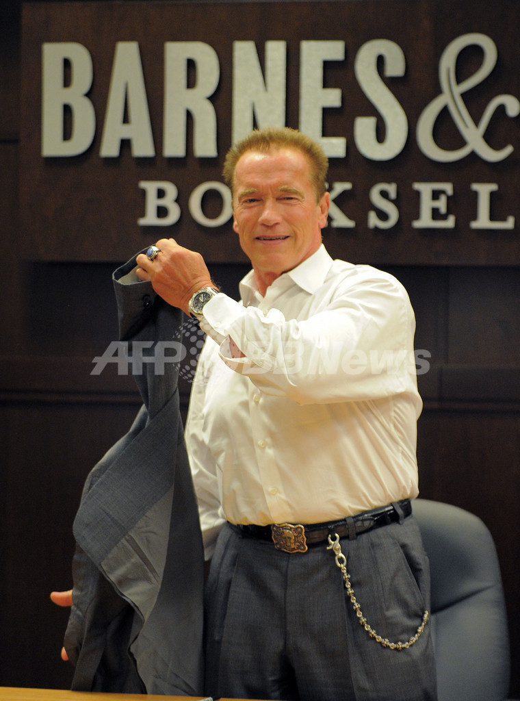 米カリフォルニア(California)州ロサンゼルス(Los Angeles)で5日、アーノルド・シュワルツェネッガー(Arnold Schwarzenegger)前州知事の回顧録「Total Recall - My Unbelievevably True Life Story」のサイン会が行われた。今月1日に発売されたこの回顧録には、妻マリア・シュライバー(Maria Shriver)さんの離婚申し立ての原因となった家政婦との隠し子問題などについて記されている(2012年10月5日撮影)。(c)AFP/JOE KLAMAR