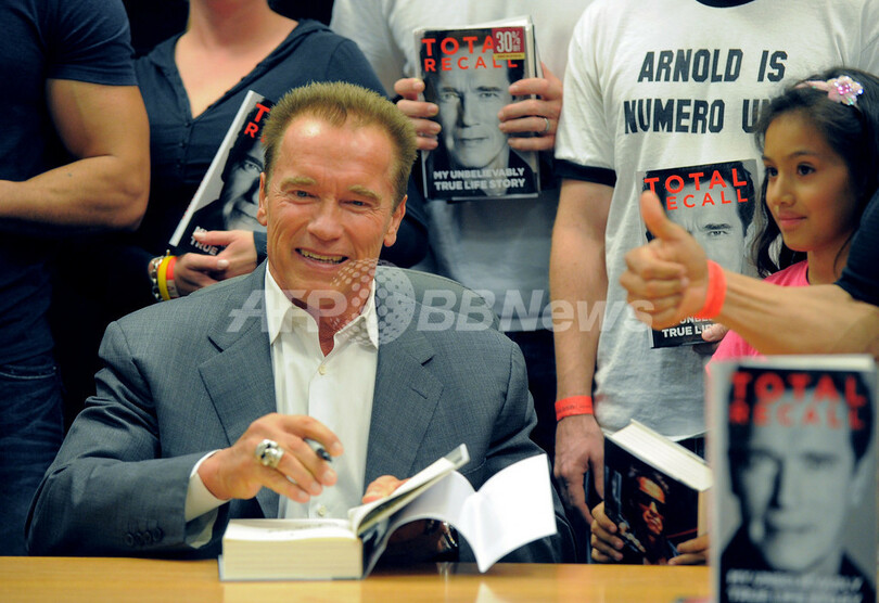 米カリフォルニア(California)州ロサンゼルス(Los Angeles)で5日、アーノルド・シュワルツェネッガー(Arnold Schwarzenegger)前州知事の回顧録「Total Recall - My Unbelievevably True Life Story」のサイン会が行われた。今月1日に発売されたこの回顧録には、妻マリア・シュライバー(Maria Shriver)さんの離婚申し立ての原因となった家政婦との隠し子問題などについて記されている(2012年10月5日撮影)。(c)AFP/JOE KLAMAR