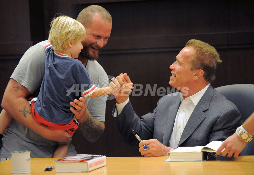 米カリフォルニア(California)州ロサンゼルス(Los Angeles)で5日、アーノルド・シュワルツェネッガー(Arnold Schwarzenegger)前州知事の回顧録「Total Recall - My Unbelievevably True Life Story」のサイン会が行われた。今月1日に発売されたこの回顧録には、妻マリア・シュライバー(Maria Shriver)さんの離婚申し立ての原因となった家政婦との隠し子問題などについて記されている(2012年10月5日撮影)。(c)AFP/JOE KLAMAR