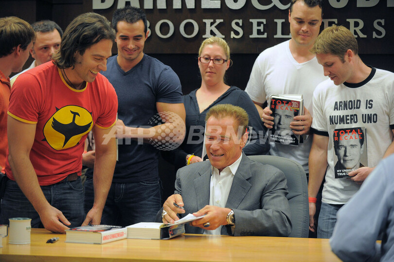 米カリフォルニア(California)州ロサンゼルス(Los Angeles)で5日、アーノルド・シュワルツェネッガー(Arnold Schwarzenegger)前州知事の回顧録「Total Recall - My Unbelievevably True Life Story」のサイン会が行われた。今月1日に発売されたこの回顧録には、妻マリア・シュライバー(Maria Shriver)さんの離婚申し立ての原因となった家政婦との隠し子問題などについて記されている(2012年10月5日撮影)。(c)AFP/JOE KLAMAR