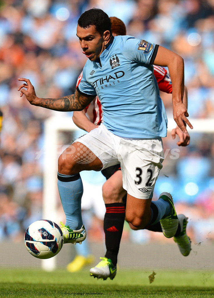 ボールをコントロールするマンチェスター・シティのカルロス・テベス(Carlos Tevez、2012年10月6日撮影)。(c)AFP/ANDREW YATES