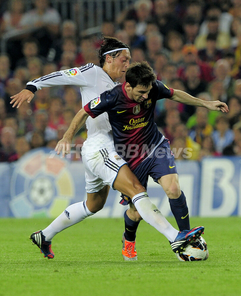 レアル・マドリードのメスト・エジル(Mesut Ozil、左)とボールを競るFCバルセロナのリオネル・メッシ(Lionel Messi、2012年10月7日撮影)。(c)AFP/JOSEP LAGO