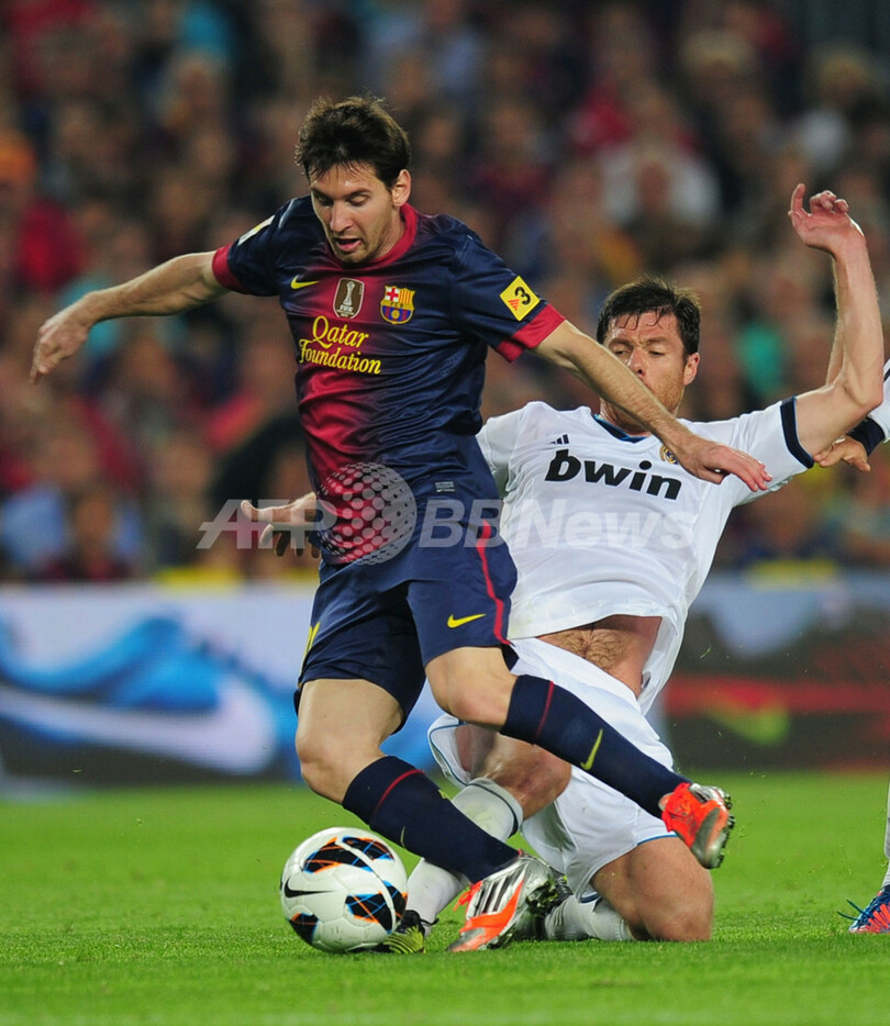 レアル・マドリードのシャビ・アロンソ(Xabi Alonso、右)とボールを競るFCバルセロナのリオネル・メッシ(Lionel Messi、2012年10月7日撮影)。(c)AFP/LLUIS GENE