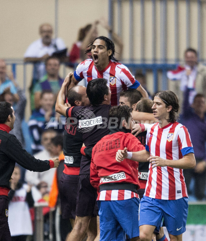 試合終了間際の勝ち越し点をチームメイトと喜ぶアトレティコ・マドリードのラダメル・ファルカオ・ガルシア(Radamel Falcao Garcia、上、2012年10月7日撮影)。(c)AFP/DANI POZO