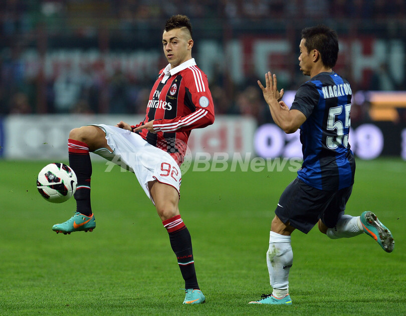 ACミランのステファン・エル・シャーラウィ(Stephan El Shaarawy、左)をマークするインテルの長友佑都(Yuto Nagatomo、2012年10月7日撮影)。(c)AFP/ALBERTO PIZZOLI