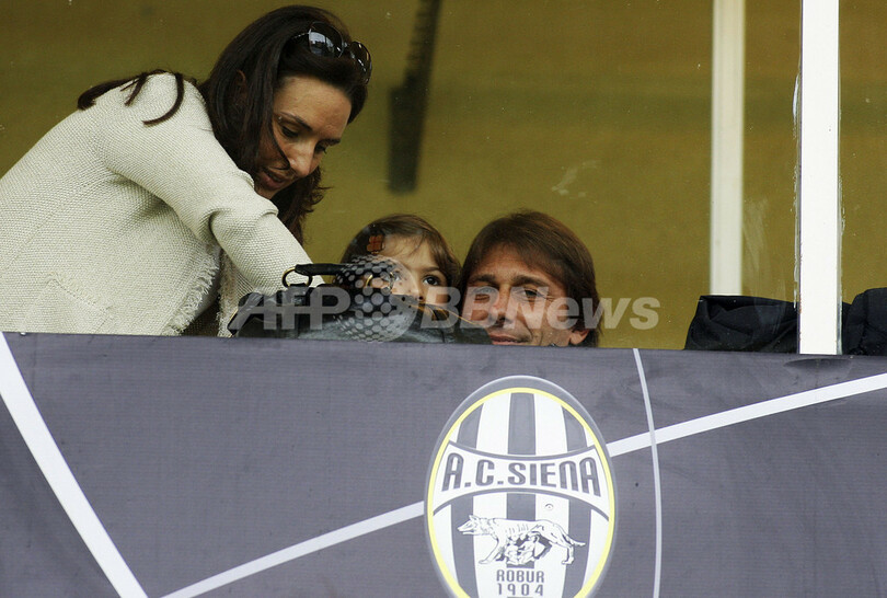 家族とともにボックス席で試合開始を待つユベントスのアントニオ・コンテ(Antonio Conte)監督(右、2012年10月7日撮影)。(c)AFP/FABIO MUZZI