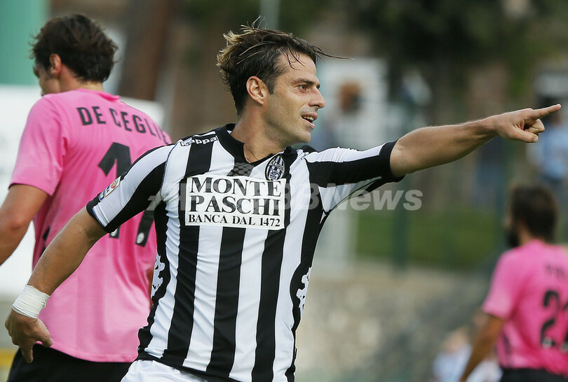 前半ロスタイムに同点ゴールを決め歓喜するシエナのエマヌエレ・カライオ(Emanuele Calaio、2012年10月7日撮影)。(c)AFP/FABIO MUZZI